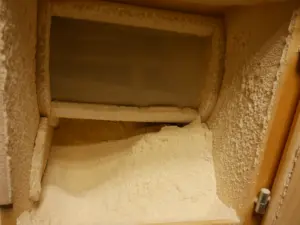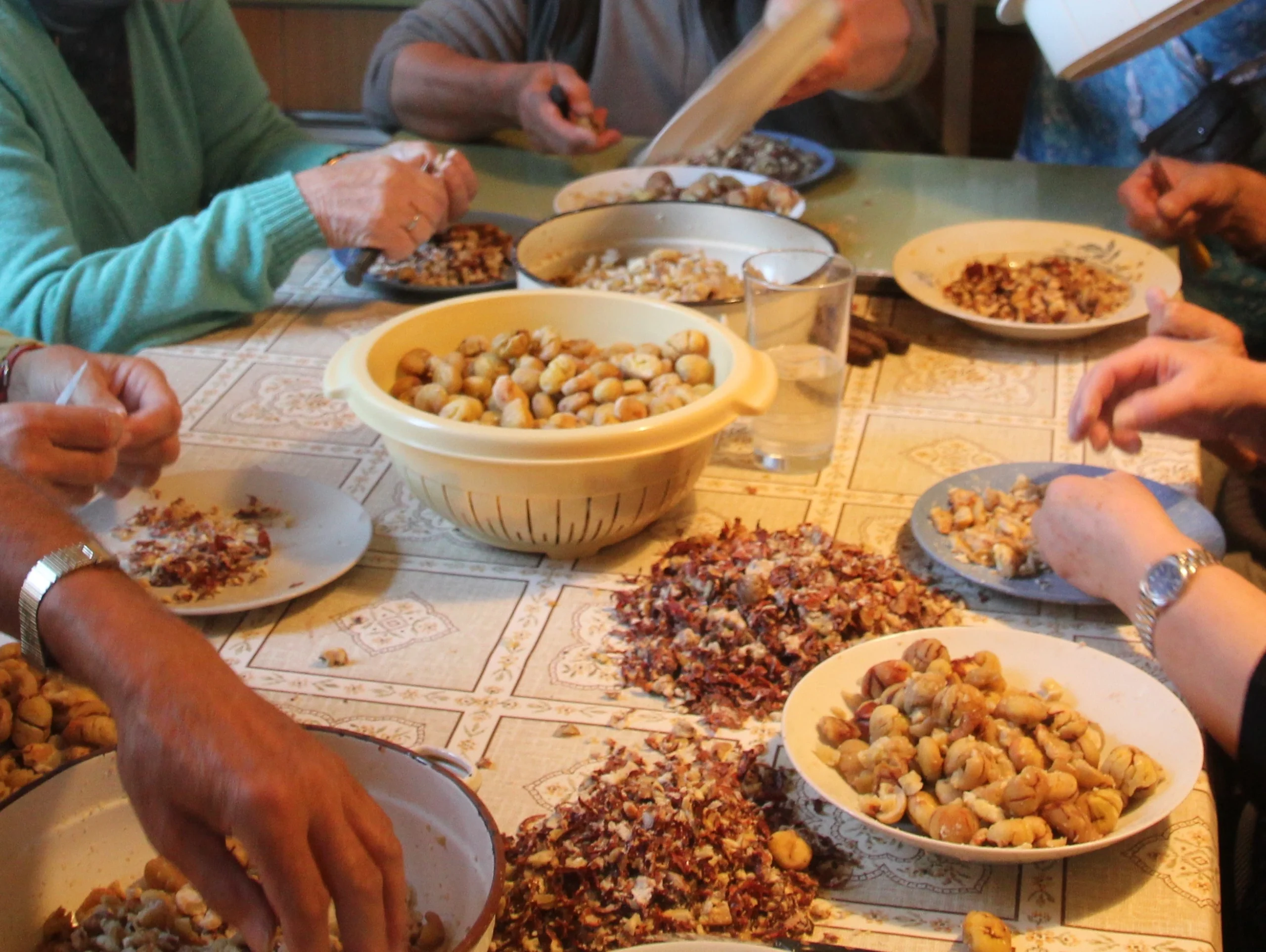 Wir mahlen unser Kastanienmehl bei Bedarf. Die Kastanien werden im Herbst nach der Ernte getrocknet, damit sie lange haltbar sind. Bei Bedarf werden die getrockneten Kastanien geschält, die schlechten aussortiert, zerkleinert und zu Mehl gemahlen.