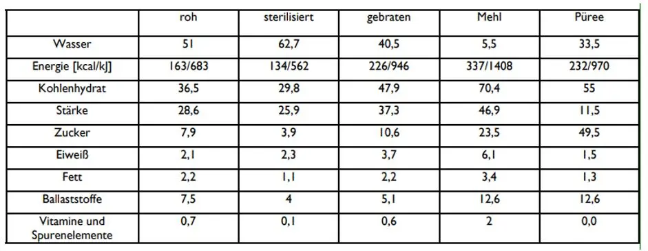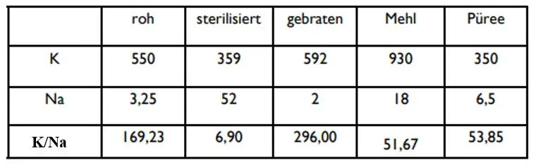 Mit der Verarbeitung der Kastanie ändert sich dieses Verhältnis von Natrium zu Kalium allerdings, wie die nächste Tabelle zeigt