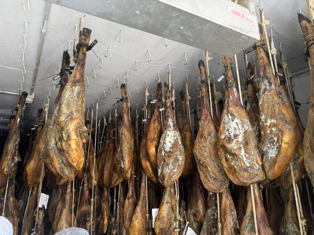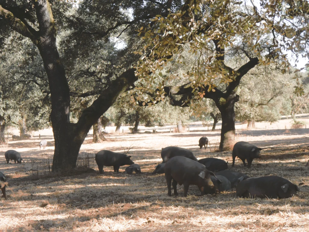 Besuch einer Produktionsstätte des berühmten spanischen Schinkens Jabugo sowie eines weitläufigen Agroforstgebietes mit Steineichen, Korkeichen, Kastanienbäumen, wilden Olivenbäumen und üppiger Bodenvegetation. In dieser Landschaft leben die Iberoschweine, die das Fleisch für den Schinken liefern. Sie ernähren sich ausschließlich von den Früchten und Pflanzen, die sie in diesem natürlichen Umfeld finden.
