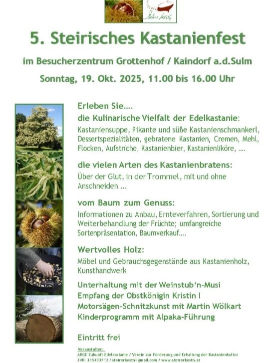 am Sonntag, 19. Oktober 2025 von 11.00 bis 16.00 Uhr im Besucherzentrum Grottenhof / Kaindorf a.d. Sulm;